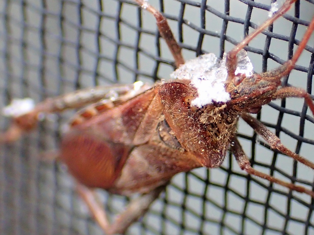 どんだけ急変だったかって、ついつい朝の気温につられて出てきちゃったマツヘリカメムシに、あっという間に雪が積もってく(笑)。