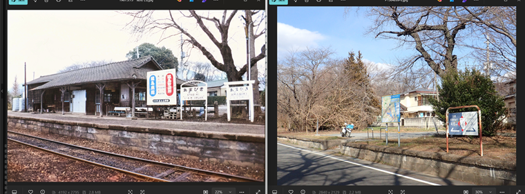 ここは廃線跡を利用したサイクリングロードが整備されており、一部ホームの痕跡も見られます。ということで雨引駅の今昔。左が1987年の撮影で、右が今回デス。