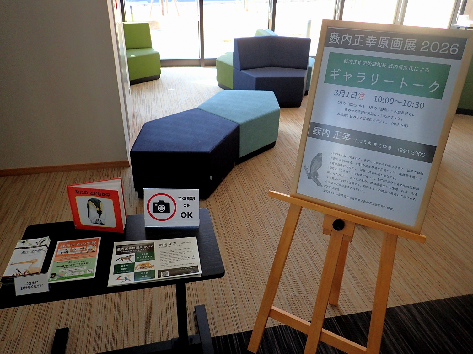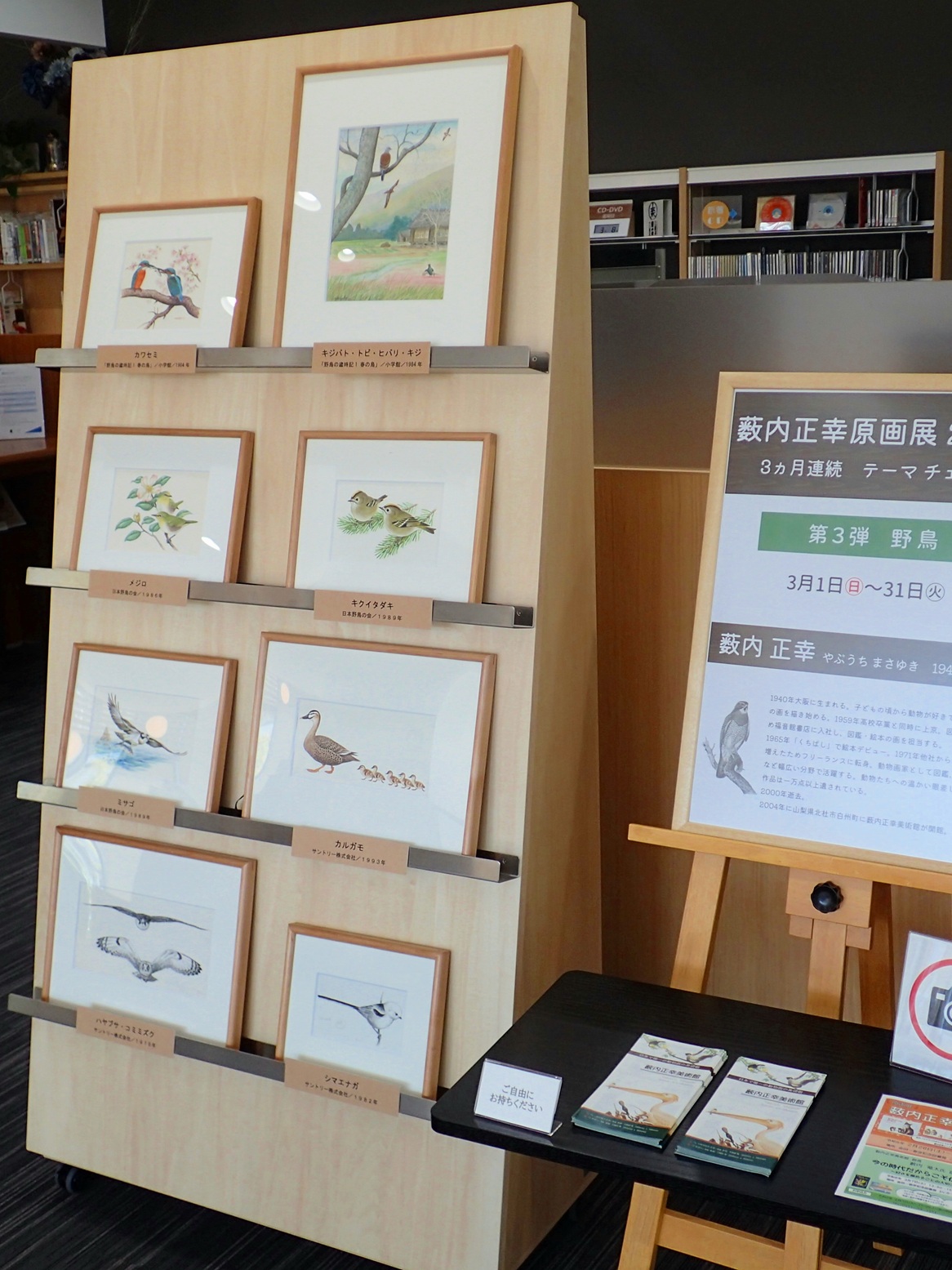 富士川町図書館では月替わりのテーマで原画展を開催中ですが(プチだけど)、今日から3月なので展示替え。新テーマは「鳥」でございます~。