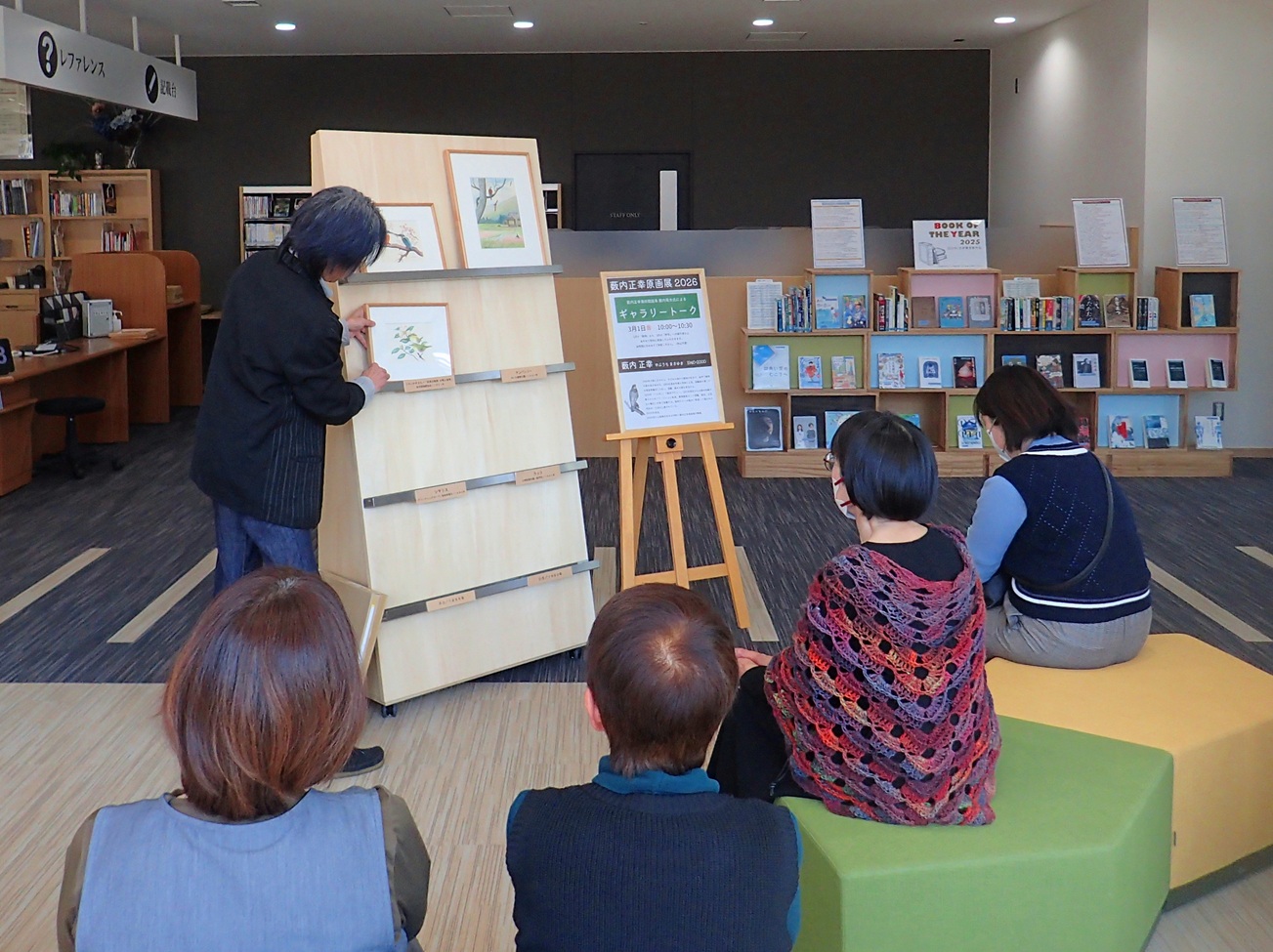 書架に画を置くだけの簡単な展示替えながら、手と目は左右のバランスに中心位置を見極めつつ、口は喋り続けて…って、思った以上にムツカシカッタでございます…。