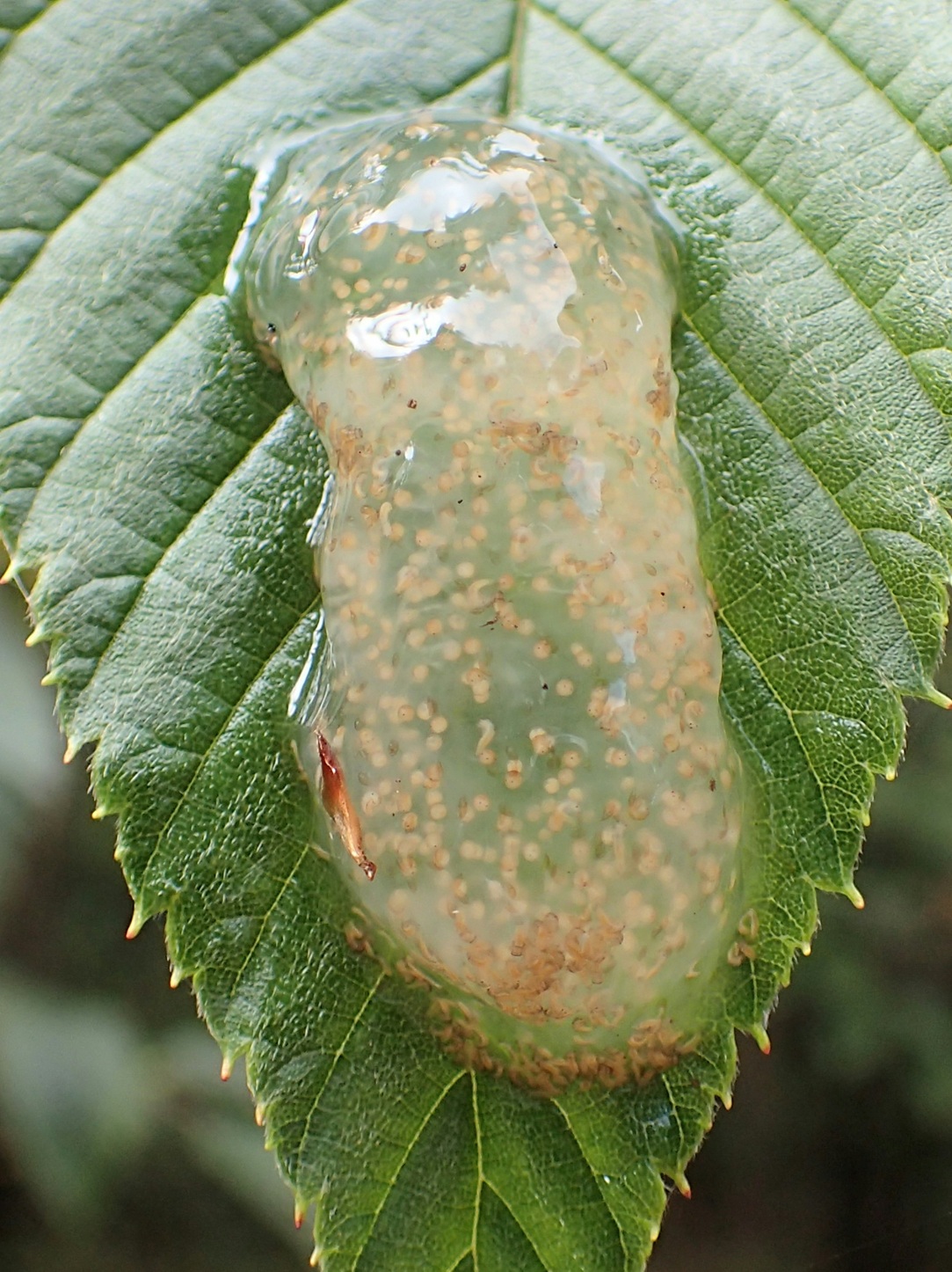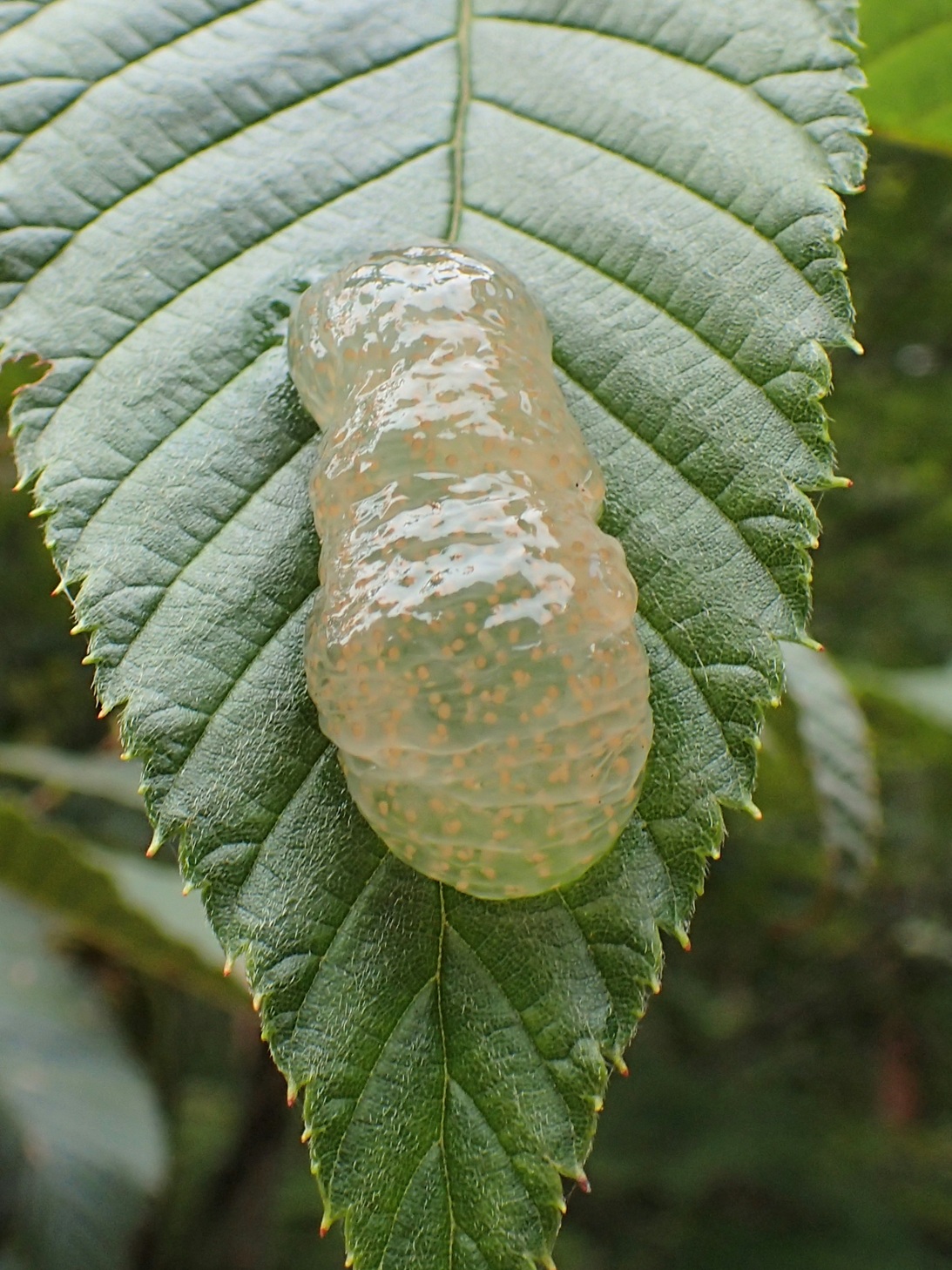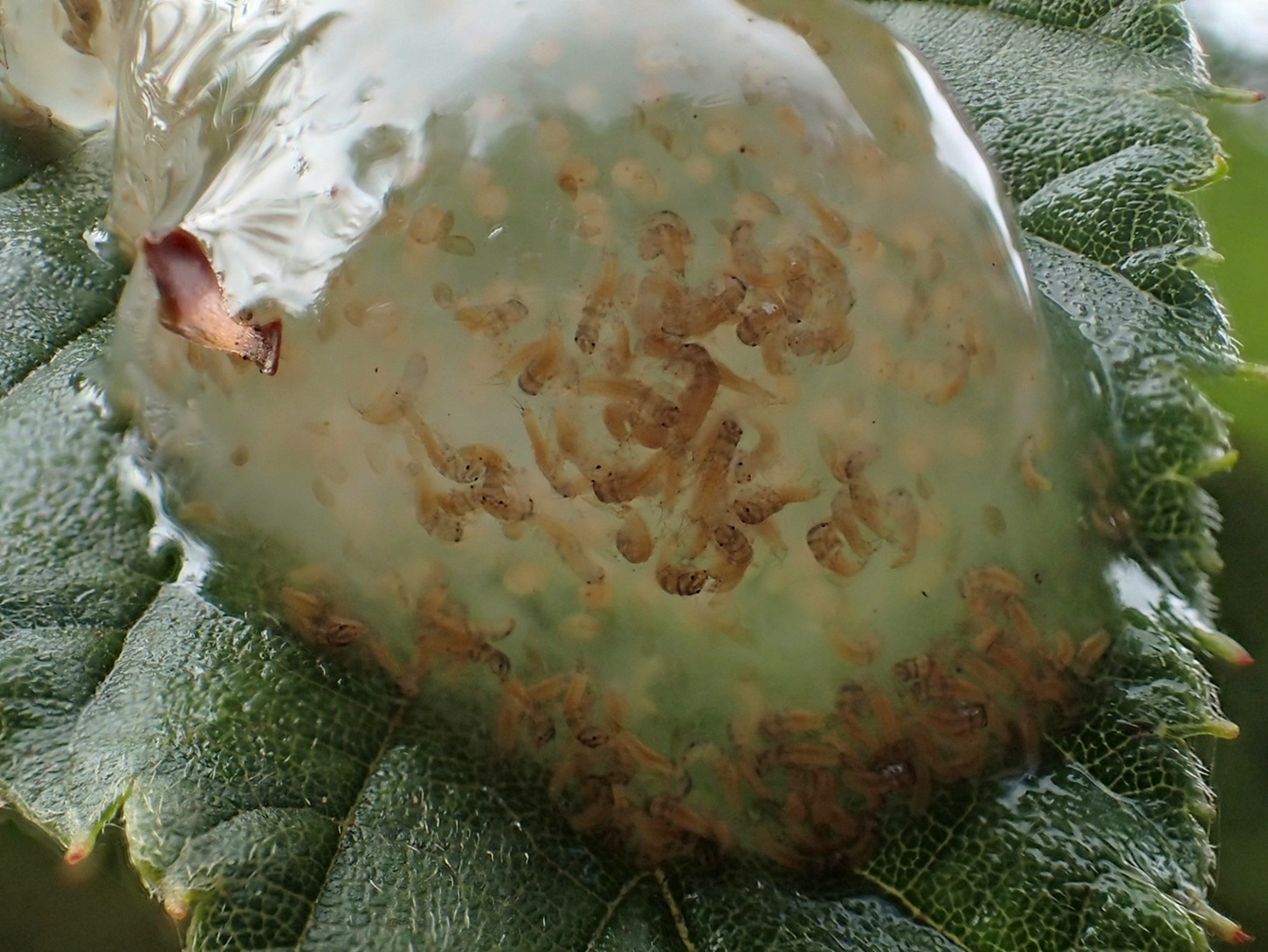 美術館のテラスに張り出した葉っぱ(ヤシャブシ?)にひっついたわらび餅を見つけたのが9月25日。そして中のツブツブに目が出てきて、今日見たら孵化してました。