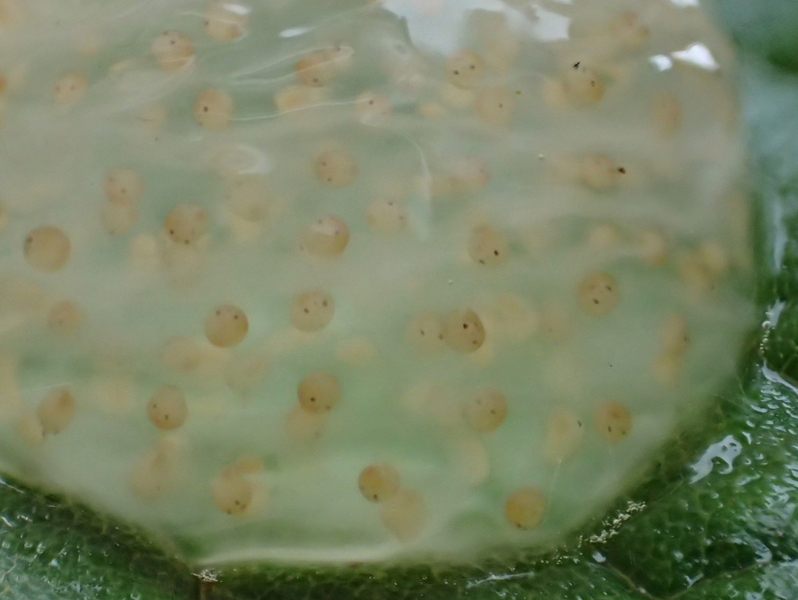 トビケラの卵塊なんですが…モリアオガエルと一緒で生まれたら水ン中に行かなきゃなのに、下に水、無いぜ!? どうすんの!?