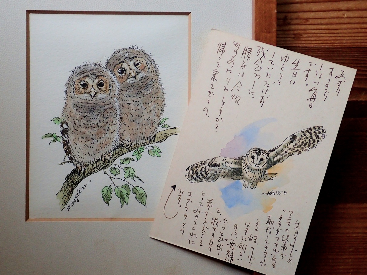 1982年に描かれたこの画、同年に出版された野鳥の会発行の「Strix」の裏表紙には似たようなフクロウの幼鳥2羽が描かれており、その元となったのがコレなの…かな? いずれにせよ(竜)は初めて見るというか、存在も知らなかった画。当時正幸宅に来られた塚本さんが帰られる際に「これ、持っていっていいですよ」って言われたそうです。