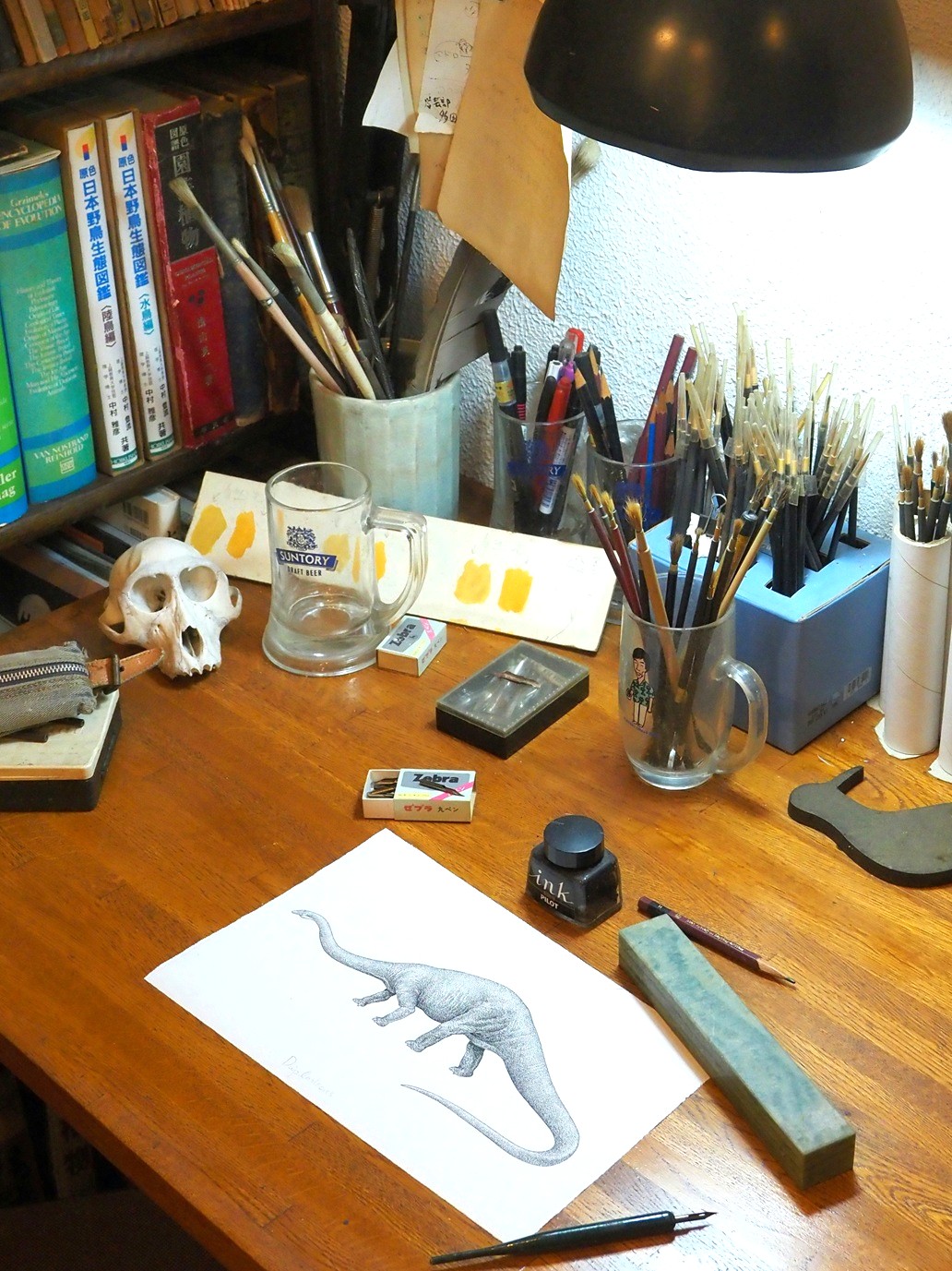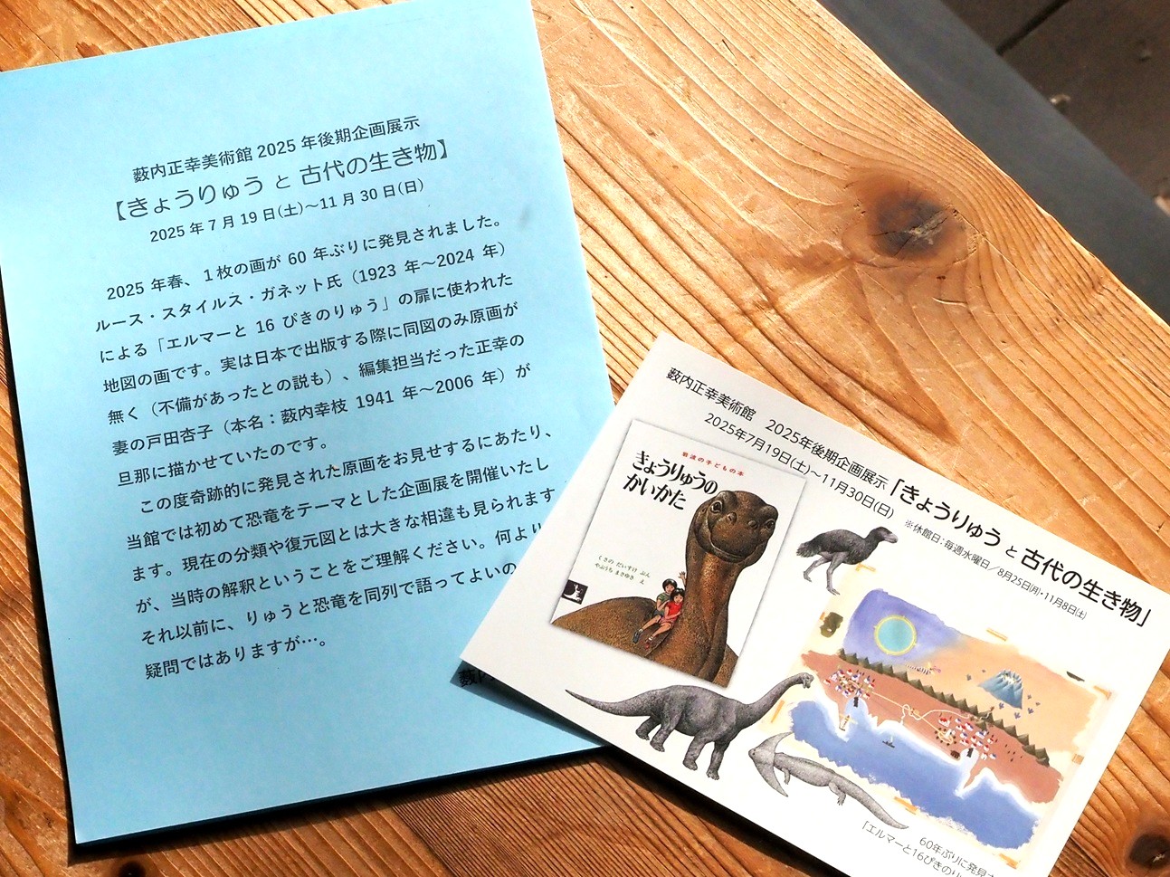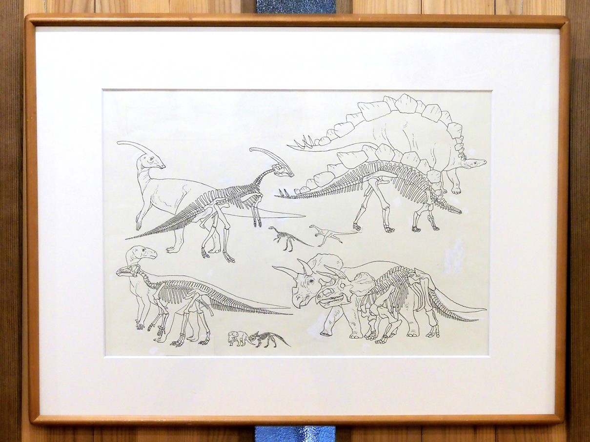 今回の見所はね、何といっても60年ぶりに見つかった「エルマーと16ぴきのりゅう」の見返しに使われた「エルマーのぼうけんず」。正幸が描いたのを知らない方は「えぇ!? あの画そうだったの!」と、ご存知の方は「これがあの原画!」って、色々な意味でみなさん驚かれてます。それとね、「きょうりゅうのかいかた」は原画全点を展示してますし、吉村証子記念科学読物賞を受賞した「日本の恐竜」に、「古脊椎動物図鑑」からは30点近くもの大量展示です!