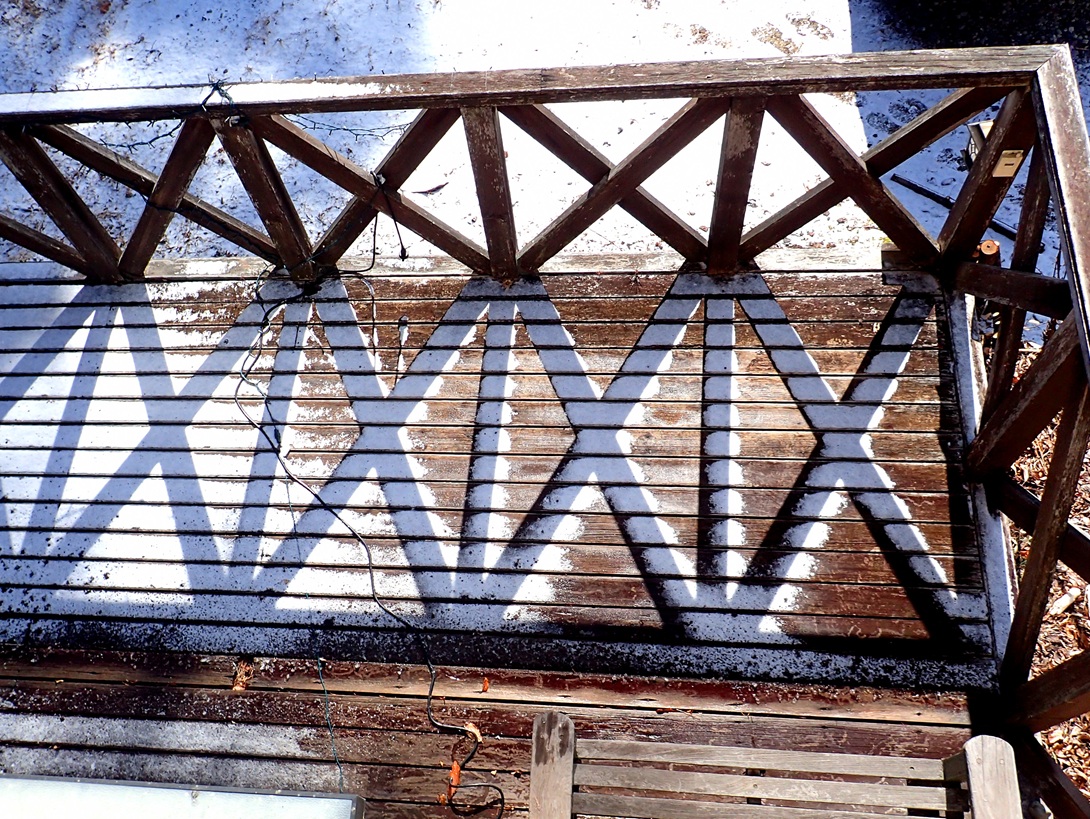 2階の窓からデッキを見れば、太陽の動きにあわせて右から左に融けた範囲が徐々に広がるものの、手すりの梁で影になるトコだけ見事に残ってる!