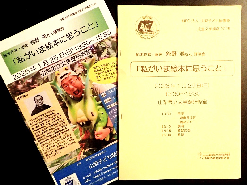 山梨県立文学館で講演会。画家であり絵本作家でもある舘野鴻さんによる「いま絵本に思うこと」なわけですが、「絵本には興味が無くてね」って、それ最初に言っちゃダメだから(笑)。