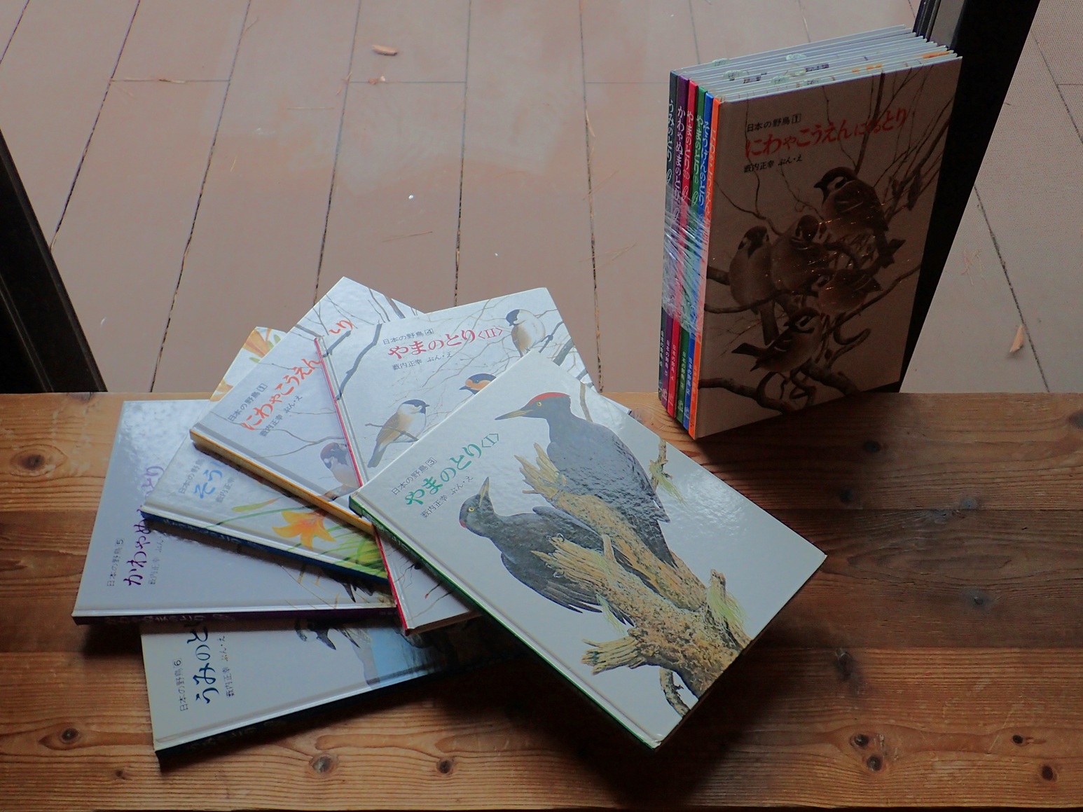展示のメインとなった日本の野鳥シリーズ「やまのとりⅠ/Ⅱ」ですが、現在は「にわやこうえんにくるとり」や「うみのとり」などとともに「野鳥の図鑑」(すべて福音館書店)に集約されています。で、単純に6冊が1冊に合本になったのかというと…分冊の時には1つの種で複数頁が使われたものはイラスト(頁)が減らされましたが、逆に新たに収録された種もあります。そして1冊にまとまって便利になった半面、判型が小さくったので当然ながら画も小さくなりました。まぁどっちが良いのかはさておき、はっきり言えるのは「分冊の方は入手不可」ってこと。ウチでもよく聞かれます「前の大きいサイズのは無いの?ここなら買えると思ったのに…」」って。